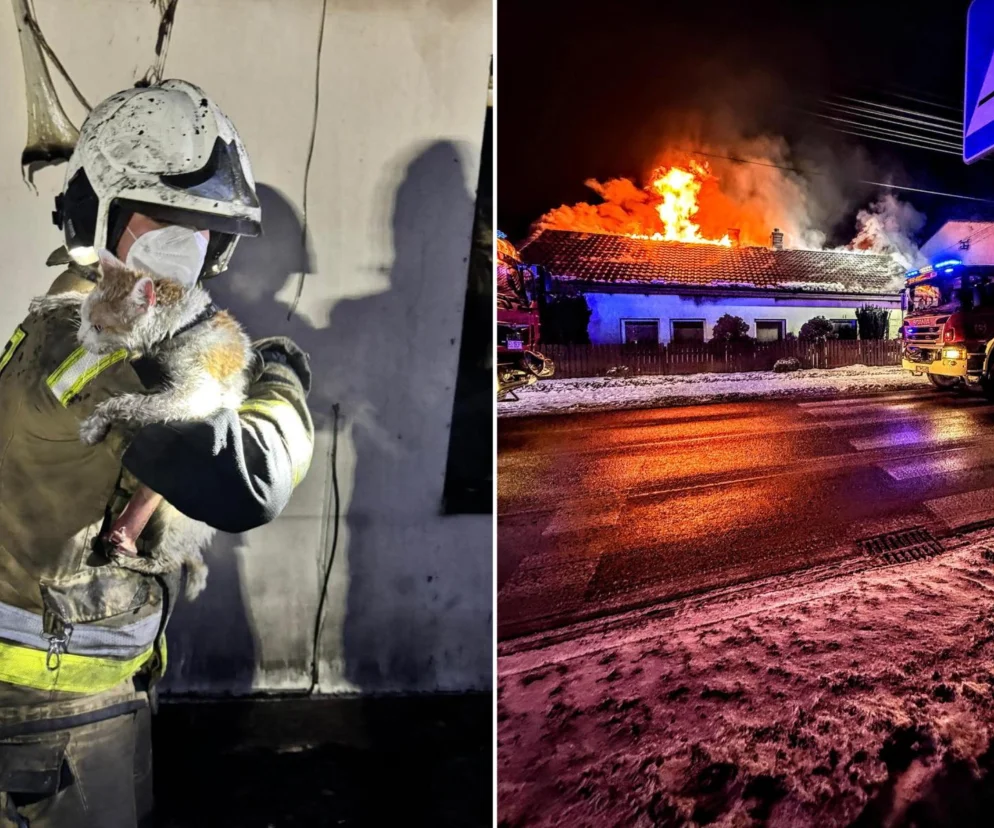 Wprawdzie wszyscy mieszkańcy zdołali się ewakuować jeszcze przed przybyciem strażaków, ale w ogarniętym ogniem domu został pies i kot. Temu pierwszemu udało się uciec przed płomieniami, ale przerażony kociak stulił się w szczelinie między łóżkiem a ścianą. Tam wypatrzyli go strażacy OSP. Michał Goździk, dowodzący z początku akcją gaśniczą, wykrył go kamerą termowizyjną, a druh Tymek ruszył we wskazane miejsce, wziął na ręce i wyniósł z budynku.