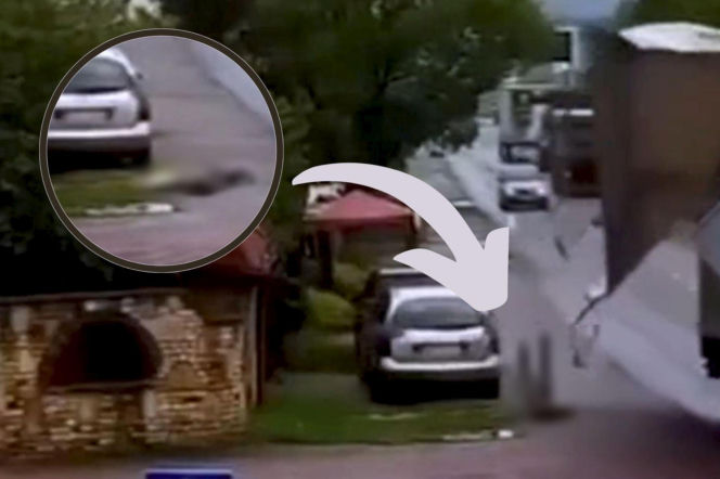Pas od tira uderzył kobietę prosto w głowę. Wszystko widać na nagraniu